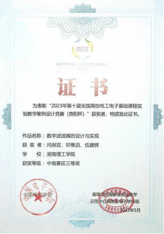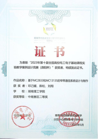 近日,​悟空体育电子信息与通信技术国家级实验教学示范中心收到2023第十届全国高校电工电子基础课程实验教学案例设计竞赛鼎阳杯中南赛区获奖证书示范中心教师邓己媛、陈松、刘翔研制“基于MC2833MC13135的窄带通信系统设计与制作”项目闫保双邓惟滔、伍建辉老师的“数字滤波器的设计与实现”项目经激烈角逐分别获二等奖和三等奖。