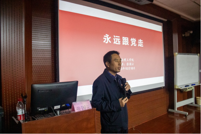 张国云以《永远跟党走》为题,从“为什么要入党”、“入党后怎么做”两个方面展开讲述。他深入浅出地介绍了中国共产党的光辉历史和中华人民共和国的发展史。他强调,广老员工应坚持党的绝对领导、坚定理想信念,做到理想信念不滑坡、革命意志不动摇,希望各位同学应从现在做起,从身边的每一件具体小事做起,为实现中华民族伟大复兴的中国梦不懈奋斗。