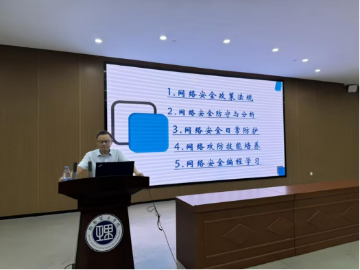 会议核心环节为网络安全专题讲座,由信息中心申丽平老师主讲,申丽平围绕五大维度展开详细讲解:一是网络安全政策法规,明确网络行为的法律边界与责任;二是网络安全防守与分析,结合实际案例解析常见网络攻击手段及防御策略;三是网络日常防护要点,分享账号密码管理、公共WiFi使用等实用防护技巧;四是网络安全技能培养,强调主动学习安全知识、提升风险识别能力的重要性;五是编程学习与网络安全,阐述规范编程习惯对防范代码漏洞、保障系统安全的关键作用。