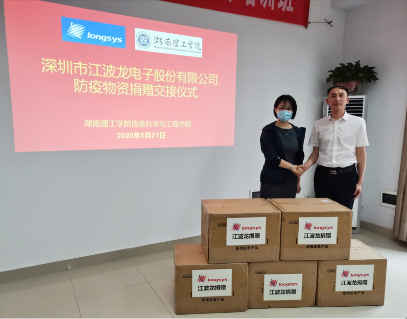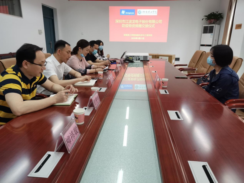 5月21日上午,受公司疫情防控办委托,公司优秀实习就业基地——深圳市江波龙电子股份有限公司爱心捐赠10000个防疫口罩交接仪式在逸夫楼16325会议室举行。公司人力行政部经理黄涛、公司经理李武出席。公司副书记徐丹主持,副经理童耀南、电子技术创新基地主任陈松、辅导员柳祎璇、荀仕杰等人参加。