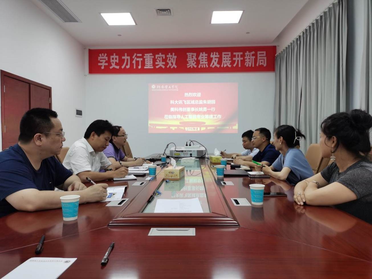 7月8日下午,悟空体育与科大讯飞在17517会议室召开人工智能专业筹建专题研讨会。经理童耀南、科大讯飞公司区域总监朱碧园、湖南美科伟创公司董事长姚勇等人参加。