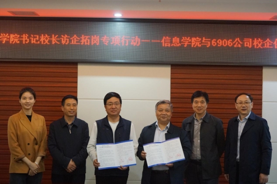 座谈会上,双方围绕校企发展、项目合作、资源共享、人才需求等内容深入交流,在共建实训基地、就业基地等方面达成一致意见。会议现场,公司党委书记甘向阳和6906公司总裁向志明作为双方代表顺利签订校企“实习与就业一体化基地建设协议书”。