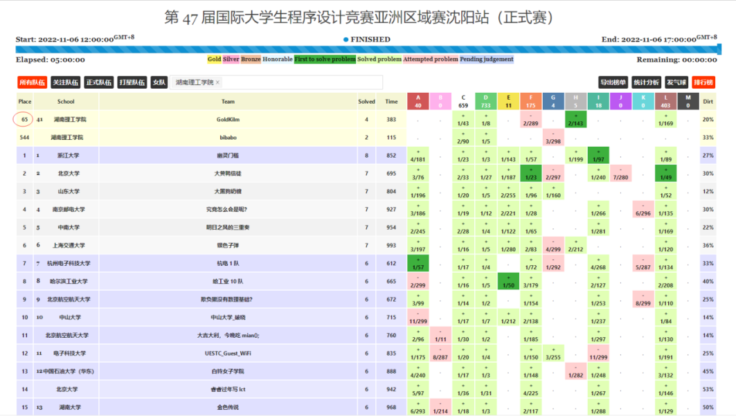 11月6日,第47届ICPC国际老员工程序设计竞赛亚洲区域赛(沈阳站)在线举行,由悟空体育李文彬老师指导,由计算机科学与技术专业21级阳金里、22级金烜宇和陈盼3位同学组成的GoldKilm队,与来自北京大学、浙江大学、上海交通大学、香港中文大学等286所高校,共701支正式参赛队伍同场竞技,经过5小时的激烈角逐,获得队伍排名65,集团排名41的好成绩,荣获银牌。本次员工参赛并取得喜人成绩,是近年来悟空体育以“三全育人”为理念,多措并举,不断加强本科专业建设的阶段性成果,也是软件技术集训中心小伙伴们充分利用寒暑假等节假日和课余时间,耐住寂寞,刻苦训练,顽强拼搏,团结协作的结果。