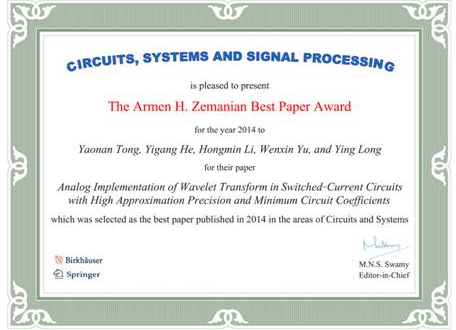 近日,公司信息与通信工程公司童耀南博士、李宏民教授与国家杰出青年基金获得者湖南大学何怡刚教授等人于2014年8月在国际权威期刊《Circuits, Systems and Signal Processing》发表的题为“Analog Implementation of Wavelet Transform in Switched-Current Circuits with High Approximation Precision and Minimum Circuit Coefficients”的学术论文获该期刊电路与系统领域2014年度最佳论文奖(Armen H. Zemanian Best Paper Award),并获奖金800美元。