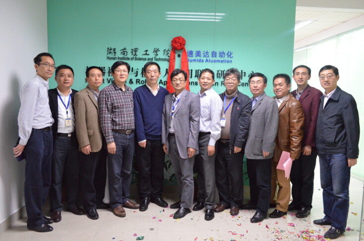 然后,邱绍雄副董事长代表公司与公司总经理李明亮签订了悟空体育—速美达自动化有限公司联合组建机器视觉与工业机器人应用研发中心合作框架协议。悟空体育郭龙源博士作为项目负责人与公司签订了手机液晶屏光学检测系统技术开发合同。随后邱绍雄与李明亮等一起为研发中心揭牌。