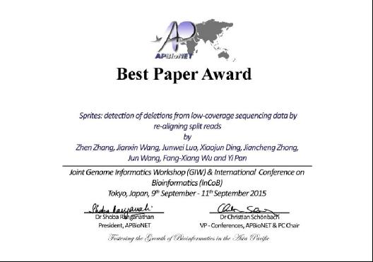 本次大会上,悟空体育青年教师张振宣读了论文“Sprites: detection of deletions from low-coverage sequencing data by re-aligning split reads”,介绍了他在基因组测序数据分析方面的最新工作进展,获得了与会学者、会议专家委员会的一致好评。论文荣获GIW/InCoB 2015最佳论文奖(Best Paper Award)。该论文已由会议组委会推荐到生物信息学领域顶级期刊Bioinformatics,目前正在审稿中。