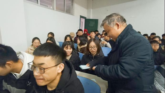 徐丹分别从考前相关准备、考中应试技巧等方面为同学们作指导,为同学们加油鼓劲,并叮嘱同学们在考前冲击的最后几天要注意规律作息,把身体和心理状态调整到最佳状态。她寄语同学们坚定信心、沉着应试、出色发挥、成功上岸。随后,老师们将带有美好寓意的星空棒棒糖、口罩、餐票等暖心礼物分发给在场同学。