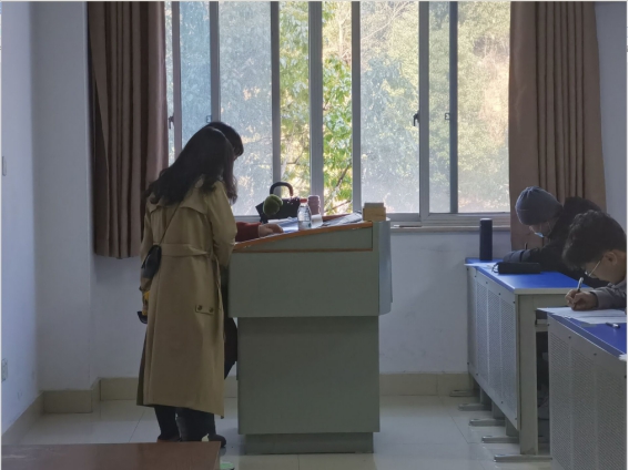 为确保考试顺利进行,徐丹带领学工办老师早早抵达教学楼,清点悟空体育员工考场人数,查看考场考风考纪状况,维护考场秩序。
