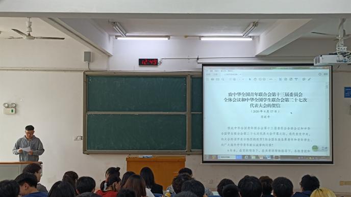 李丝语在会上宣读《关于学联员工会工作人员改进作风、服务同学的若干规定》及“我为青年做实事”活动倡议书,并分享个人体会。她提到“我为青年做实事”就是要坚持“从员工中来、到员工中去”原则。
